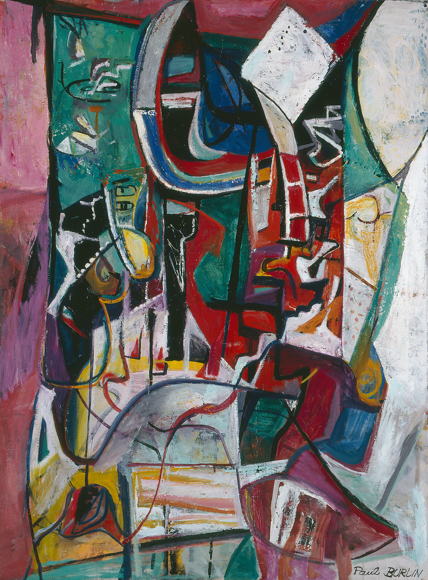 During his long career, Paul Burlin was associated with everything from the Ashcan School to Abstract Expressionism. His paintings of the fifties, such as Theme in Red, show the stimulus of Cubism in their elaborate structure coupled with the action painter’s interest in “finding the painting in the act of painting it.”